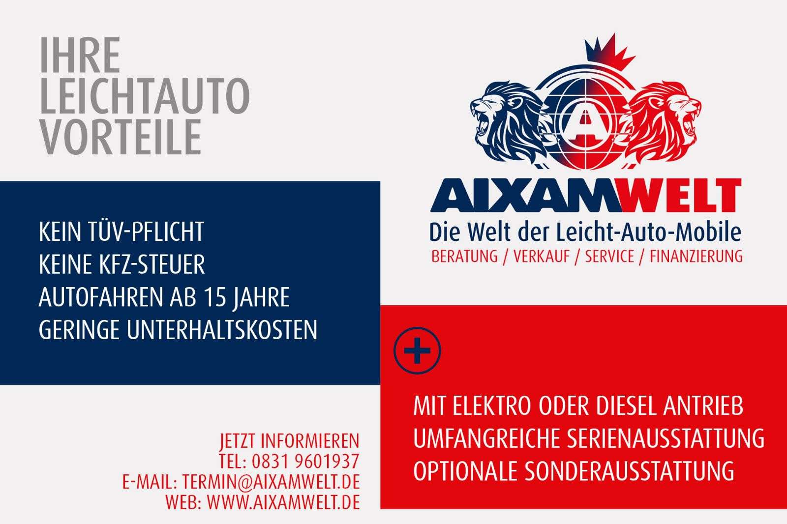 Pritsche - der Elektro KLein-Last-Wagen ein kompaktes Nutz-Leichtkraftfahrzeug - robust, zuverlässig und vielseitig, passt es sich Ihren Aktivitäten an und wird zu einem unverzichtbarer Partner im Alltag.'*Zusatzausstattungen können Zusatzpreise beinhalten, wie zum Beispielelektrische Fensterheber, Radio Einbau, Anhängerkupplung ect.Auch mit Finanzierung ohne oder mit Anzahlung möglichFragen Sie uns einfach nach den KonditionenSelbstverständlich liefern wir Ihnen auf Wunsch auch Ihr Fahrzeug mit einer Transportversicherung direkt bis vor die HaustürGEMACHT FÜR DIE PROFESSIONELLE NUTZUNGAIXAM PRO unterstützt Profis in ihren täglichen Aktivitäten.Bewegen, laden, entladen, transportieren...Hersteller: Aixam ProModellreihe: D-TruckModell: PritscheGetriebe: AutomatikgetriebeSERIENAUSSTATTUNG*Inklusive 12 Volt SteckdoseAblagefächer in Türen und vor BeifahrersitzAbschließbarer TankdeckelArmaturenbrett mit moderner Automobil-SpritzgusstechnikAußenspiegel links und rechts (von innen einstellbar)ErsatzschlüsselFußmatten aus GummiHandschuhfach mit Münz- und GetränkehalterHeckfenster in der KabineHeizungslüftung mit zwei StufenInnenbeleuchtung mit TürkontaktschalternInnenspiegel mit AbblendfunktionKabinendach schallisoliertKopfstützenLaderaumklappe unter Pritsche abschliessbarLED TagfahrlichtLeichtgängige LenkungLenkradschlossLuftausströmerRadiovorbereitungRadzierblendenRückfahrscheinwerfer rechtsNebelschlussleuchte linksNutzlastbefestigungshaken (4 Stk.)Schalldämmung Fahrgastzelle und MotorraumSchalthebel in ArmaturenbrettScheibenwischer mit Doppelarminkl. Intervallschaltung und elektrischer ScheibenwaschanlageSicherheitsgurte AutomatikSignalhorn elektrischSignalton «Licht an»Sitze in Längsrichtung verstellbarSonnenblende Fahrer und BeifahrerStahlfelgen 13 ZollTageskilometerzählerTürgriffe außen schwarz mattWarnblinkanlage mit automatischer Aktivierung bei VollbremsungWegfahrsperre bei eingelegtem GangOPTIONALE AUSSTATTUNGEN *AufpreispflichtigAnhängerkupplungElektrik Paket (Fensterheber, Zentralverriegelung, bei Van auch Hecktüre)ErsatzradGitteraufbauGittergestell hinter KabineLED Warndreieck und 2 RundumleuchtenPannenset (Warndreieck, Erste-Hilfekasten, 2 Warnwesten)Autoradio mit MP3/RDS/AUX/USB/Bluetooth ohne CD inklusive 2 LautsprecherRammschutzrohr hintenRammschutzrohre seitlichReflektorstreifen Stufe 1Reflektorstreifen Stufe 2Rundumleuchte LEDZusatzheizungWarnton für Rückwärtsfahrt (Serie bei Truck)Winterräder auf Stahlfelgen 145/70/R13TECHNISCHE DATENMotormarke MAVEL Efx48TypFunktionsprinzipSynchron-PermanentmagnetmotorMax. Nenndauerleistung (kw ECE)6 kw / 30`Max. Spitzenleistung (kw ECE) 9,04Umdrehnung bei Spitzenleistung (U/min)von 2.130 bis 5.500Max. Drehzahl (U/min) 5.500Motorkühlung EigenbelüftetElektrischer Geschwindigkeitsregler SynchronFür den Antrieb benutzter Energytyp 48 V LithiumbatterienEnergiekapazität (kWh bei C/5 und 20°C) 7,26Reichweite nach Testzyklus ECE47130 kmGEWICHTE (KG)Leergewicht 375kg (mit Batterie 440kg)Maximal zul. Gesamtgewicht 857kgNutzlast 327kgMaximale Anhängelast (gebremst/ungebremst) 187kgMaximal zul. Gesamtgewicht Fahrzeug + Anhänger 1044kgABMESSUNGEN (MM)Breite ohne Spiegel: 1500Höhe (+/- 25): 1750Ladekante: 750Länge: 2911Breite der Ladefläche: 1465Länge der Ladefläche: 1395Ladefläche (m2): 2Rauminhalt (m3): 0,6Seitenhöhe der Bordwände / Laderaumhöhe: 300Spur vorne: 1345Spur hinten: 1248Radstand: 2252CLEVER UND KOMPAKTAixam Pro ist ideal zum Befahren enger Orte oder für zum sicheren transportieren sowie be- und entladen Ihrer Ausrüstung. Unerwartete Missionen oder regelmäßige Touren: In allen Lagen ein unentbehrlicher Begleiter. Seine kompakte Größe, sein großzügiges Volumen und seine abschließbaren Türen (optional per Funkfernbedienung) sind praktisch in allenSituationen.AB 15 JAHREN AIXAM PRO FAHREN MIT MOPEDSCHEIN AMDen D-Truck gibt es auch als Truck mit reinem ElektroantriebAIXAM PRO 24 Monate Herstellergarantie ohne KilometerbegrenzungBesichtigung und Probefahrt nach vorheriger Terminv