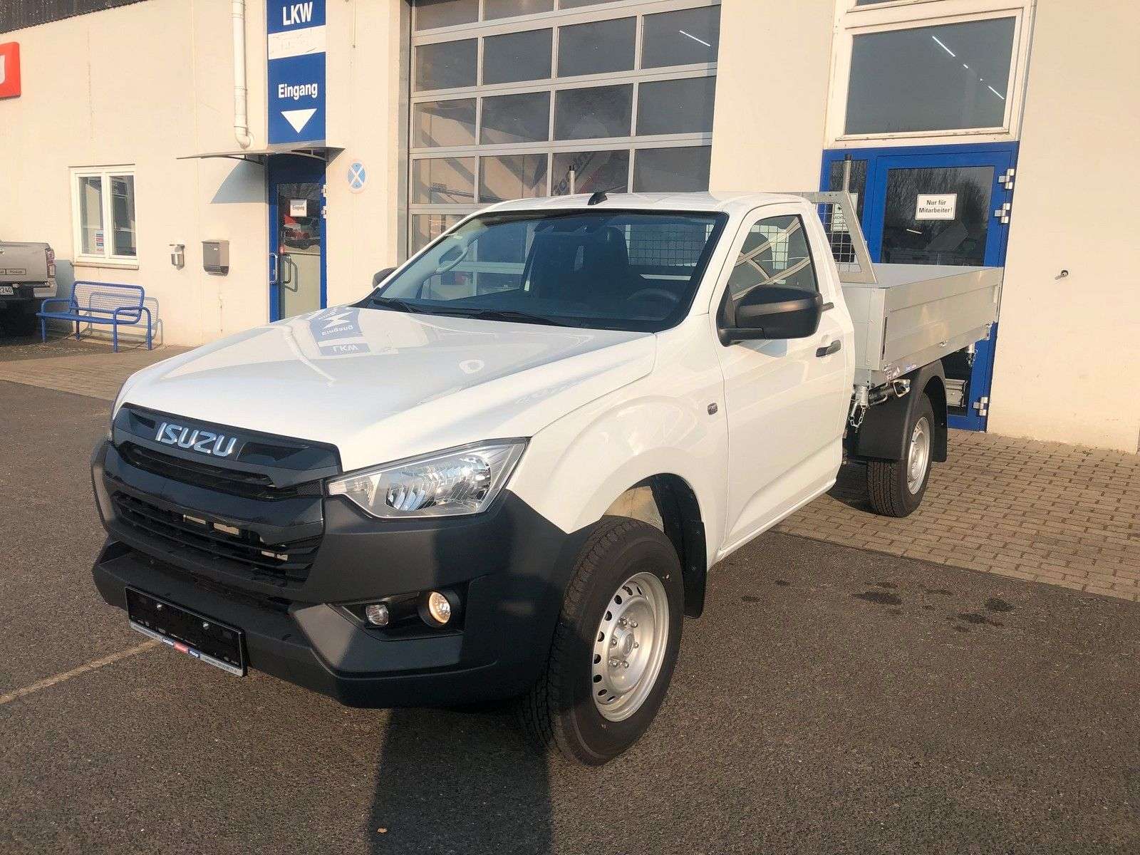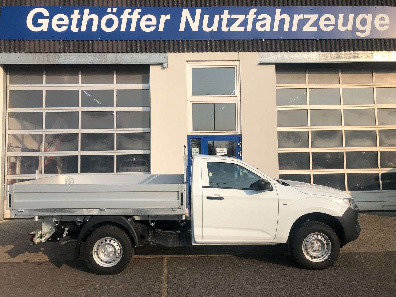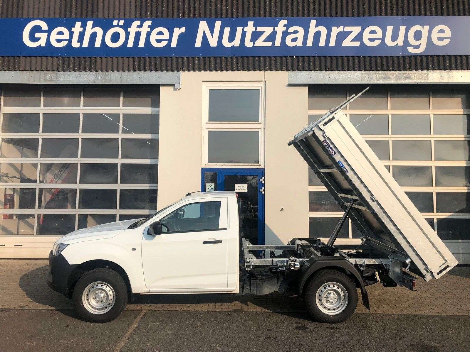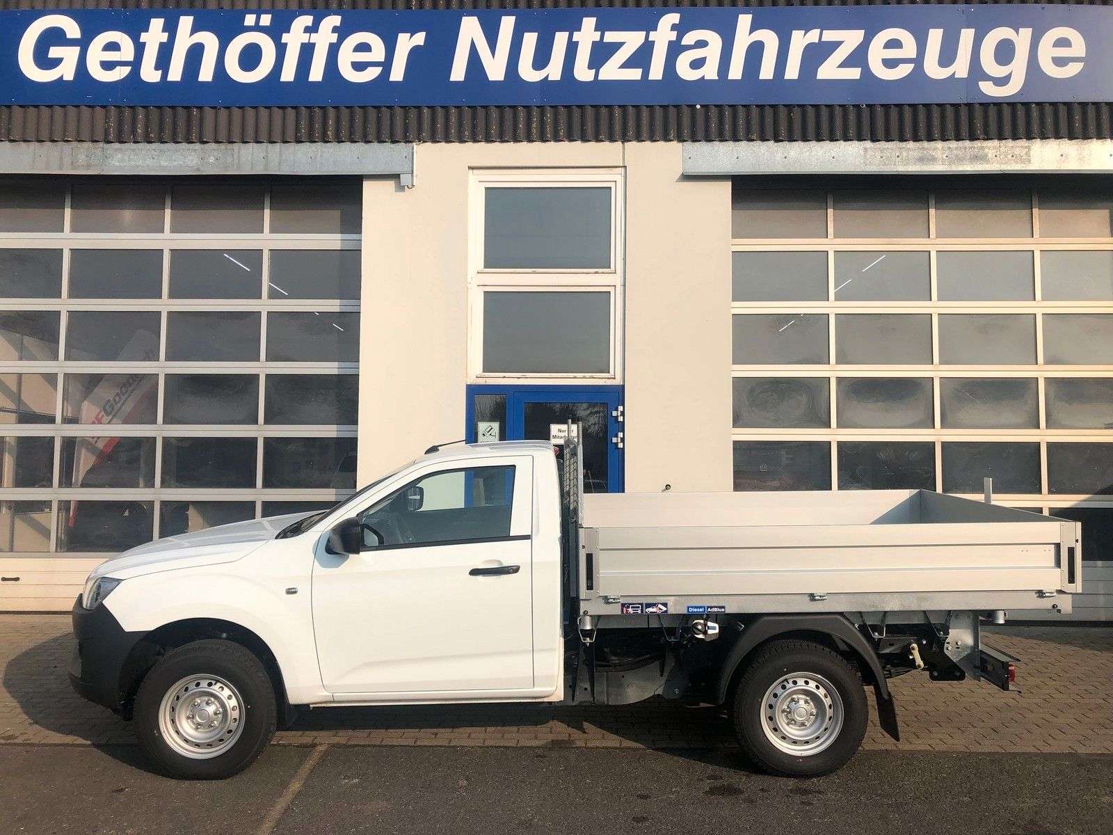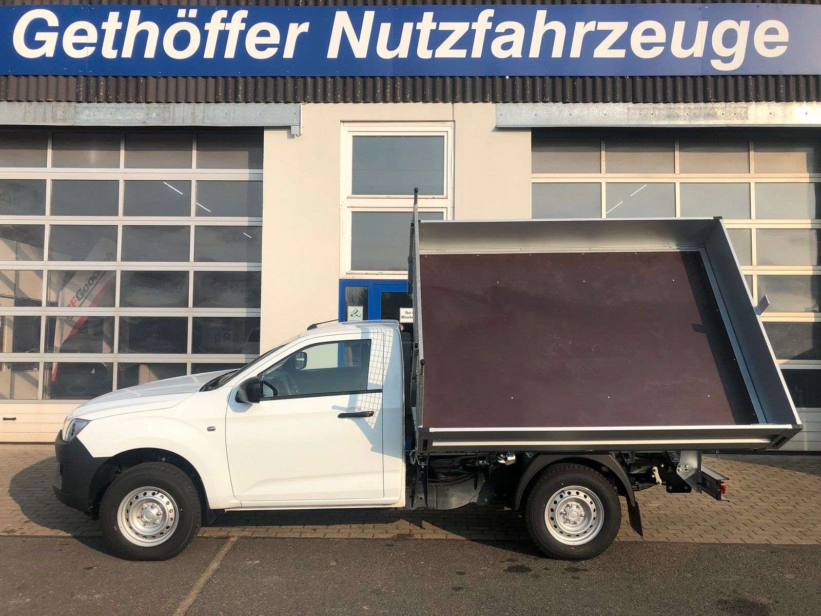 en bei Gethöffer Nutzfahrzeuge-- Nutzfahrzeugkompetenz seit 1984 --r sind offizieller ISUZU Haupthändler und die erste Adresse, wenn es um speziell auf Ihre Bedürfnisse konzipierte und entsprechend umgebaute D-Max geht!Zudem sind wir die Entwickler und Hersteller der radstandverlängerten Variante - BIG-MAX -Abgerundet wird unser Sortiment durch die robusten Hapert Qualitäts-Anhänger für Profis.Bei uns haben Sie die Wahl:r haben immer mindestens 20 ISUZU D-Max Pickup in verschiedenen Kabinen-, Ausstattungs- und Aufbauvarianten sowie 20 Hapert Anhänger der vier Baureihen (Pritsche, Kipper, Koffer und Transporter) auf unserem Betriebsgelände vorrätig.Gerne zeigen wir Ihnen die Fahrzeuge, beraten Sie über Unterschiede, technische Details und Aufrüstungsmöglichkeiten.Besuchen Sie uns in 25436 Uetersen, ca. 30 km nordwestlich von Hamburg.Die folgenden Informationen beziehen sich auf das in diesem Inserat angebotene Fahrzeug: D-Max Single Cab L MT in weiss mit 3-Seiten-Kipper!!! SOFORT VERFÜGBAR !!! Tageszulassung auf Grund gesetzlicher BestimmungenZubehör: Dieses Fahrzeug wird in der Serienausstattung des Herstellers angeboten.Zubehör:Anhängerkupplung3-Seiten-Kipper 2.535 x 1.840 x 350mmLeiterträgertechnische Eintragung und Tageszulassungr empfehlen eine Auflastung auf 3.500 Kg zul. Gesamtgewicht, wenn Sie dauerhaft oder regelmäßig mit hoher Beladung unterwegs sind.Der Mehrpreis beträgt € 4.600,- netto oder € 5.474,- bruttoEs werden 245/75R16 AT Ganzjahresreifen auf Alufelgen mit erhöhter Traglast montiert und eine Zusatzluftfederung an der Hinterachse montiert.Optionales Zubehör (gegen Aufpreis):Hardtops und andere LaderaumabdeckungenZusatzscheinwerfer, Bügel, nden, Standheizungen, …Alu-Felgen mit AT Bereifung in Standard- und XXL GrößenFahrwerke, Höherlegungen, Body-Lifts und ZusatzluftfederungenAuflastungen an Vorder- und Hinterachse bis zu 3.500 Kg GesamtgewichtAufbauten jeglicher Art: Pritschen, Dreiseitenkipper, Absetzkipper, Abrollkipper, …Auch Fahrgestelle für Wohnkabinen und Speziallaufbauten können realisiert werdenDas alles auch in Kombination mit einer Radstandverlängerung (BIG-MAX) bis zu 80 cmBitte kontaktieren Sie uns, um ein individuelles und bedarfsgerechtes Angebot zu erhalten.Die folgenden Informationen gelten für alle unsere Inserate des ISUZU D-Max ab Modelljahr 2020 und sind inhaltlich identisch:Der ISUZU D-Max ist ein heckangetriebener Pickup mit zuschaltbarem Allradantrieb und gehört in die Nutzfahrzeug-Kategorie N1 der Geländefahrzeuge.Der D-Max Typ BTF (ab Modelljahr 2020) wird für den europäischen Markt in folgenden Versionen angeboten: ∗1 Motor: Motor: 1,9 L Common-Rail VGS-Turbodiesel mit 120 KW und 360 Nm2 Getriebe: manuelles 6-Gang Getriebe oder 6-Gang Automatik (nicht im SiC)3 Kabinen: Single Cab (SiC), Space Cab (SC) und Double Cab (DC)4 Varianten: Ausstattung L (alle), LS (SC und DC), LSE (SC und DC) und V-CROSS (DC)7 Farben: weiß (uni, Serie) und 6 Metallic bzw. MicaIn den angefügten Bildern finden Sie eine Übersicht der 4 verfügbaren Ausstattungsvarianten L, LS, LSE und V-Cross, der Farben sowie einen Auszug der umfangreichen Assistenz- und Sicherheitssysteme.Basisdaten: Abgasnorm Euro 6d, Partikelfilter, SCR Katalysator, Harnstoff (AdBlue) und Abgasrückführung20+ Assistenz und Sicherheitssysteme (ADAS), 5 Sterne NCAP CrashtestFahrer-/Beifahrer-/Kopf- und Seitenairbag, Klimaanlage, Geschwindigkeitsbegrenzer, …Der D-Max ist ein geländegängiges Nutzfahrzeug, äußerst robust und hoch belastbar:30° Böschungswinkel vorn und 24° hinten27 cm Bodenfreiheit vorne und 24 cm hinten23° Rampenwinkel und 49° maximaler Kippwinkel(die vorstehenden Daten sind beim SiC mit Serienbereifung abweichend)80 cm Wattiefe (bei allen Fahrzeugvarianten)3.500 Kg zulässiges Gesamtgewicht1.450 Kg Vorderachslast und 1.910 Kg Hinterachslast (Auflastung möglich)1.000 Kg Nutzlast und mehr bei allen Modellen möglich3.500 Kg Anhängerlast (alle 4x4!)6.000 Kg zulässiges Zuggesamtgewicht (7.000 Kg beim Big-Max)Garantie:∗12 Jahre: auf