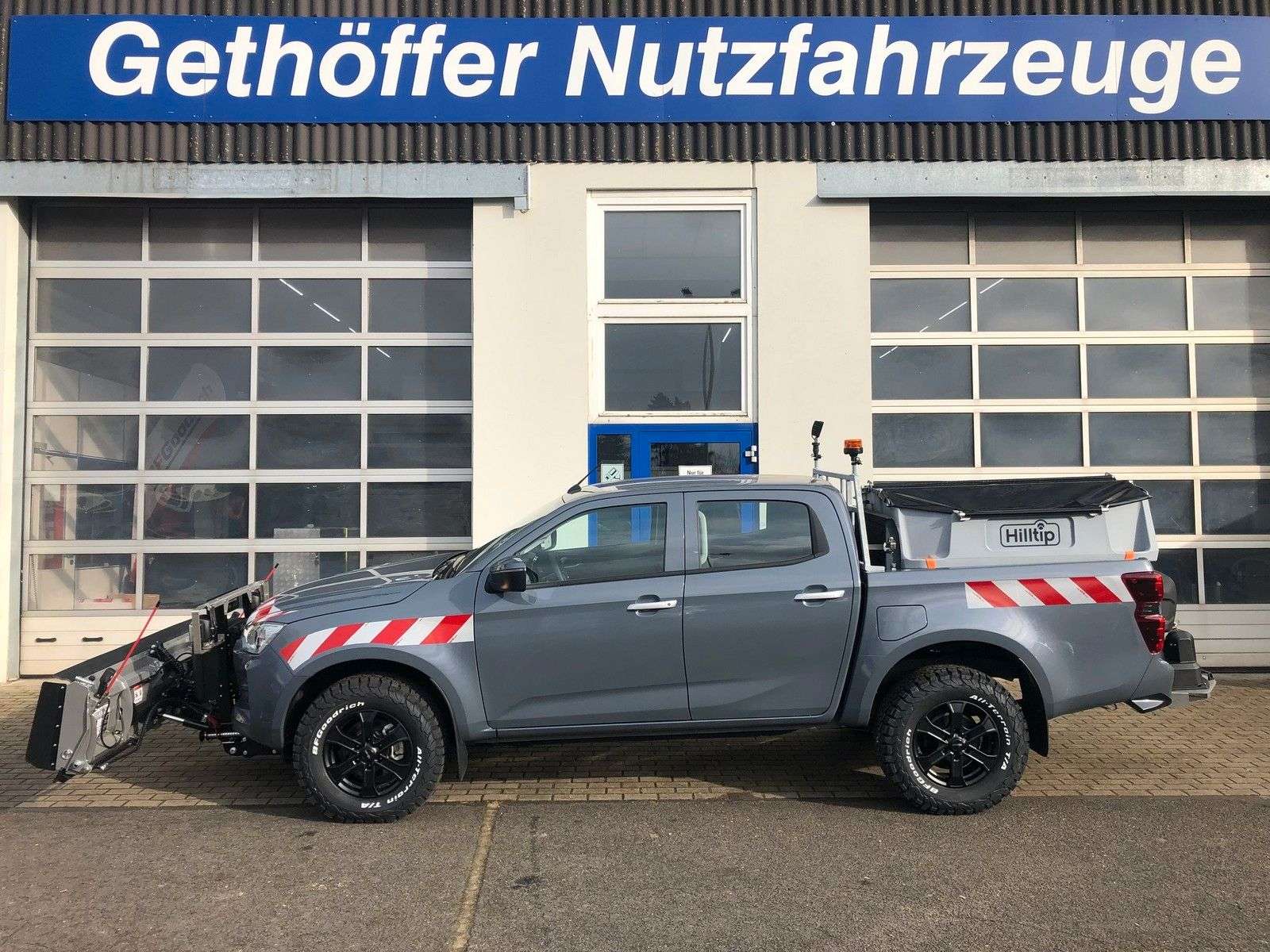 en bei Gethöffer Nutzfahrzeuge-- Nutzfahrzeugkompetenz seit 1984 --r sind offizieller ISUZU Haupthändler und die erste Adresse, wenn es um speziell auf Ihre Bedürfnisse konzipierte und entsprechend umgebaute D-Max geht!Zudem sind wir die Entwickler und Hersteller der radstandverlängerten Variante - BIG-MAX -Abgerundet wird unser Sortiment durch die robusten Hapert Qualitäts-Anhänger für Profis.Bei uns haben Sie die Wahl:r haben immer mindestens 20 ISUZU D-Max Pickup in verschiedenen Kabinen-, Ausstattungs- und Aufbauvarianten sowie 20 Hapert Anhänger der vier Baureihen (Pritsche, Kipper, Koffer und Transporter) auf unserem Betriebsgelände vorrätig.Gerne zeigen wir Ihnen die Fahrzeuge, beraten Sie über Unterschiede, technische Details und Aufrüstungsmöglichkeiten.Besuchen Sie uns in 25436 Uetersen, ca. 30 km nordwestlich von Hamburg.Die folgenden Informationen beziehen sich auf das in diesem Inserat angebotene Fahrzeug:D-Max Double Cab LS AT in Islay Gray mit nterdienstausstattung!!! SOFORT VERFÜGBAR !!! Tageszulassung auf Grund gesetzlicher BestimmungenZubehör:Hilltip 1826-SFP Flex SnowStriker Schneeschild, hydraulisch verstellbare Schneeschildbreite von 1.800 mm bis 2.600 mmHilltip IceStriker 550 Streuer mit KennzeichenhalterungHilltip LED Rundumleuchte am Streuer und LED Arbeitsscheinwerfer rotAuflastung auf zul. Gesamtgewicht von 3.500 KgAlufelgen mit erhöhter TraglastAT GanzjahresreifenZusatzluftfederung an der HinterachseAuflastung der Vorderachse4 Schwerlastösen drehbar ( 1.000 Kg Lastaufnahme pro Stück )10 Zoll Infotainmentsystem mit Navigationssystem und RückfahrkameraAnhängerkupplungLadeflächenbeschichtungStirnwandgitter mit LED Arbeitsscheinwerfer und LED RundumleuchteLED FrontblitzerLED RückfahrscheinwerferRot-Weiße KFZ-Warnmarkierung gemäß DIN 30710Heckklappenhalter an der StirnwandTageszulassung mit technischer EintragungDieses Fahrzeug wird in der Serienausstattung des Herstellers angeboten.· Bereifung 265/60R18 auf Leichtmetallfelge· Center Airbag zwischen den Vordersitzen· Differentialsperre, elektrisch zuschaltbar· Einparkhilfe hinten· Heckklappe abschließbar· Sitzheizung vorne· Stoßfänger vorne und hinten in Wagenfarbe, hinten integriert· Adaptiver Tempomat (nur Automatik)· Tempomat (nur manuelles Getriebe)· Klimaanlage· Geschwindigkeitsbegrenzer (60-180 km/h einstellbar)· Lendenwirbelstütze, einstellbar· Lenkrad höhen- und weitenverstellbar· Regensensor· Verkehrszeichenerkennung mit intelligentem Geschwindigkeitsbegrenzer· Tote-nkel-Überwachung· Notbremsassistent und Kollisionswarnung· Lichtsensor mit automatischer Fernlichtsteuerung· Spurhalteassistent (passiv + aktiv)· Tote-nkel-Überwachung (Double Cab)Optionales Zubehör (gegen Aufpreis):· Fahrwerke, Höherlegungen, Body-Lifts und Zusatzluftfederungen· Aufbauten jeglicher Art: Pritschen, Dreiseitenkipper, Absetzkipper, Abrollkipper, …· Das alles auch in Kombination mit einer Radstandverlängerung (BIG-MAX) bis zu 80 cmBitte kontaktieren Sie uns, um ein individuelles und bedarfsgerechtes Angebot zu erhalten.Der D-Max ist ein geländegängiges Nutzfahrzeug, äußerst robust und hoch belastbar:· 30° Böschungswinkel vorn und 24° hinten· 27 cm Bodenfreiheit vorne und 24 cm hinten· 23° Rampenwinkel und 49° maximaler Kippwinkel(die vorstehenden Daten sind beim SiC mit Serienbereifung abweichend)· 80 cm Wattiefe (bei allen Fahrzeugvarianten)· 3.500 Kg zulässiges Gesamtgewicht· 1.450 Kg Vorderachslast und 1.910 Kg Hinterachslast (Auflastung möglich)· 1.000 Kg Nutzlast und mehr bei allen Modellen möglich· 3.500 Kg Anhängerlast (alle 4x4!)· 6.000 Kg zulässiges Zuggesamtgewicht (7.000 Kg beim Big-Max)Garantie: · 12 Jahre: auf Durchrostung (von innen nach außen)· 5 Jahre: auf das Fahrzeug (bzw. 100.000 Km)· 2 Jahre: auf originale ISUZU Ersatzteile und Zubehör· 1 Jahr: auf alle weiteren Nachrüstungen und AufbautenDie vorstehenden Garantiezeiten gelten ab Erstinbetriebnahme!Bei Vorführ- oder Gebrauchtfahrzeugen verkürzen sich die Fristen entsprechend.Voraussetzung ist die Ein