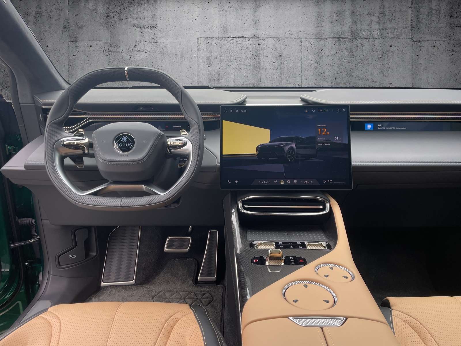 ts: 1. HandScheckheftgepflegtTechnik +Sicherheit:ESPABSASRFahrerairbagSeiten-AirbagsBeifahrer-AirbagDiebstahlwarnanlageAußentemperatur-AnzeigeFahrw ParkbremseElektr. Bremssystem (EBS)Fahrwerksregelung: Adaptives DämpfungssystemPre-CrashServolenkungelektr. WegfahrsperreNotbrems-Warnblinkautomatik (ESS)Multimedia: NavigationssystemAutotelefonFreisprecheinrichtungSoundsystemSprachsteuerungdigitaler RadioempfangBluetoothRadioWLANTouch ScreenFond EntertainmentAndroid AutoInduktionsladen für SmartphonesCarPlayMusikstreaming integriertAssistenzsysteme: BerganfahrassistentRückfahrkameraSpurwechselassistentSpurhalteassistent (lane assist)Verkehrszeichen-ErkennungTempomat (GRA): autom. DistanzregelungTotwinkelassistent (side assist)ParklenkassistentEinparkhilfeEinparkhilfe hintenEinparkhilfe vornRegensensorLichtsensorGeschwindigkeitsregelanlage (GRA) TempomatAbstandswarnerHead-up-Display (HUD)Seitenkamera360° KameraInnen: Klimaautomatik: MehrzonenklimaautomatikKlimaautomatikStandheizungMultifunktionslenkradBordcomputerelektrische FensterheberFensterheber elektr. 4*Virtuelles CockpitDurchladeeinrichtungGepäckraumabdeckungFußmattenSportlenkradKlimaautomatik 4 ZonenDachhimmel AlcantaraLenkrad beheizbarStandklimaanlageDachhimmelSitze + Polster: SitzheizungSitzheizung vorne + hintenMittelarmlehneMittelarmlehne vorneMemorysitz(e)elektr. Sitz(e)Komfortsitz(e) vornbelüftete Sitz(e)LendenwirbelstützeEinstieghilfe ("Easy Entry")Fahrersitz höhenverstellbarRücksitzbank umlegbarMassagesitzeelektr. Sitzeinstellung, hintenIso-FixAussen: ZV mit Funkfernbedienungelektr. AussenspiegelZentralverriegelungGlasdachZentralverriegelung: Keyless Entrygetönte ScheibenAußenspiegel beheizbarSpoilerAußenspiegel elektr.: MemoryspiegelScheinwerfer +Leuchten:LED-RückleuchtenLED-ScheinwerferScheinwerferregulierungAbbiege-/KurvenlichtTagfahrlichtLED-Tagfahrli HomeComing HomeBlendfreies FernlichtRäder + Reifen: Reifendruck-KontrolleLeichtmetallfelgenLeichtmetallfelgen: 23"SommerreifenPannensetSonstiges: - Lotus Eletre S - Galloway Grün- 23 Zoll 5-Speichenfelgen- grüne Bremssättel 6 Kolben- Beige Lederausstattung mit schwarzen Kontrasten- Schwarzes Lederlenkrad- Aerodynamikpaket mit Spoiler- Dimmbares Glasdach- Interieur Carbon Paket- Getönte Scheiben hinten- Parkpaket- AutobahnassistantGerne unterbreiten wir Ihnen Leasing- oder Finanzierungsangebote nach Ihren Wünschen.Wir freuen uns auf Ihren Anruf.Ihr Lotus Leipzig Team.Änderungen, Zwischenverkauf und Irrtümer vorbehalten!