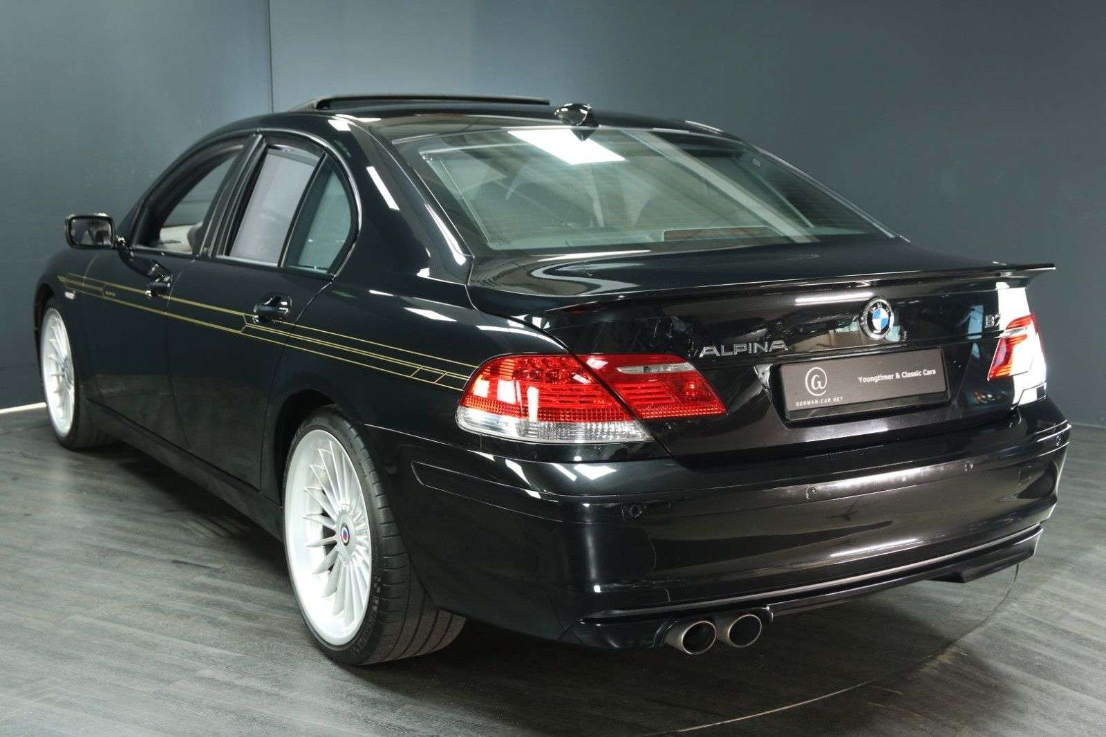 bungDieser Alpina B7 war stets in Deutschland zugelassen. Der aktuelle Eigentümer, in dessen Auftrag wir den B7 anbieten, besitzt das Auto seit 2019 und hat lediglich etwa 3.000 Kilometer mit ihm zurückgelegt.Der Zustand des Alpina ist einfach außergewöhnlich gut. Erheblich besser, als man es bei einem bald zwanzigjährigen Auto erwarten könnte.Der gesamte Innenraum überzeugt durch einen beinahe unbenutzt wirkenden Zustand. Das Leder duftet ausgesprochen verführerisch ...Für weitere Fragen und Informationen zu diesem Alpina oder für einen sichtigungstermin rufen Sie uns gern an oder schreiben uns eine E-Mail. Telefon: 0 46 24 - 803 1933E-Mail: niels.baumann@german-car.net BordmappeDie original Alpina Bordmappe aus schwarzem Leder ist erhalten. Darin befinden sich:die triebsanleitung von BMWdie Zusatzbetriebsanleitung von Alpinadas Verzeichnis der BMW Service-Stützpunkte (Europa)die Pflegehinweisedas originale Alpina ServiceheftIn diesem Scheckheft sind folgende Einträge zu finden:Übergabedurchsicht vom 8.5.2006 (Einlegerpapier)Einfahrkontrolle vom 05.07.2006 bei 2.577 Kilometern (BMW Maintal)Service am 18.11.2009 bei 18.971 Kilometern (BMW Maintal)Service am 26.09.2013 bei 28.539 Kilometern (BMW Wiesbaden)Service am 04.07.2014 bei 43.558 Kilometern (BMW Wiesbaden)Service am 07.11.2014 bei 53.437 Kilometern (BMW Wiesbaden)Service am 08.05.2015 bei 61.131 Kilometern (BMW Wiesbaden)Service am 14.09.2016 bei 70.073 Kilometern (Alpina Buchloe)Service am 02.05.2017 bei 71.397 Kilometern (Alpina Buchloe)Service am 03.09.2018 bei 74.423 Kilometern (Alpina Buchloe)Zusätzlich verfügen wir über folgende Dokumente:TÜV Gutachten vom 09.05.2006 bei 0 Kilometern (Neuwagenabnahme)Abgasuntersuchung bei 27.09.2013 bei 28.538 KilometernDekra richt vom 27.09.2013 bei 28.538 KilometernService Arbeitsblatt vom 07.11.2014 bei 53.437 KilometernService Arbeitsblatt vom 08.05.2015 bei 61.129 KilometernService Arbeitsblatt vom 13.05.2015 bei 61.617 KilometernTÜV richt vom 19.05.2015 bei 61.880 KilometernServicerechnung vom 14.09.2016 bei 70.073 KilometernServicerechnung vom 02.05.2017 bei 71.397 KilometernTÜV richt vom 07.08.2017 bei 74.407 KilometernServicerechnung vom 03.09.2018 bei 74.423 KilometernFahrzeugbewertung vom 13.08.2019 bei 76.962 KilometernTÜV richt vom 08.10.2019 bei 77.342 KilometernServicerechnung vom 11.08.2020 bei 78.335 KilometernGTÜ richt vom 18.10.2021 bei 78.657 KilometernTÜV richt vom 14.11.2023 bei 79.069 KilometernAusstattungAusgestattet ist unser Alpina B7 E65 ausgesprochen umfangreich. Er besitzt:AutomatikSchiebehebedach in GlasausführungKlimaautomatikWurzelholz4 elektrische FensterheberRadio mit CD-Wechsler undNavigationsystemelektrisch verstellbare Außenspiegelelektrisch verstellbarer Sitz vorn links mit Memoryelektrisch verstellbarer Sitz vorn rechts mit MemorySitzheizungMittelarmlehne vorn und hinten, jeweils mit FachFreisprecheinrichtunggetönte ScheibenMultifunktionslenkradDoppelairbag und Seitenairbags in den vier TürenServoschließungAlpina FußmattenPompadourtaschen an den Rückenlehnenelektrische Rollos in den FondtürenHeckrollo elektrischDachhimmel in schwarzKopfstützen im FondAlpina LeichtmetallfelgenSpiegel im Dachhimmel des Fonds, ausklappbarelektrisch verstellbare LenksäulePark Distance ControlReifendruckkontrolleKofferraumdeckel schließt und öffnet elektrischReserverad (Leichtmetallfelge)Alpina DekorInnenspiegel automatisch abblendendNebelscheinwerferBi-XenonscheinwerferScheinwerferreinigungsanlageetc. etc.Für weitere Fragen und Informationen zu diesem phantastischen Alpina B7 oder für einen sichtigungstermin rufen Sie uns gern an oder schreiben uns eine E-Mail.Telefon: 0 46 24 - 803 1933E-Mail: niels.baumann@german-car.netZwischenverkauf und Irrtümer für dieses Angebot sind ausdrücklich vorbehalten. Die Fahrzeugbeschreibung dient lediglich der allgemeinen Identifizierung des Fahrzeuges und stellt keine Gewährleistung im kaufrechtlichen Sinne dar. Ausschlaggebend sind einzig und allein die Vereinbarungen in der A